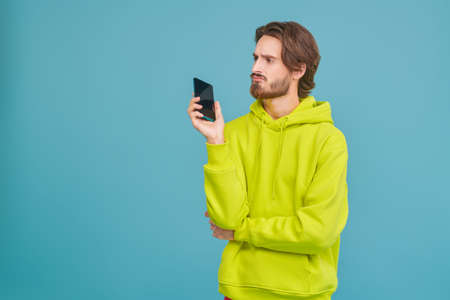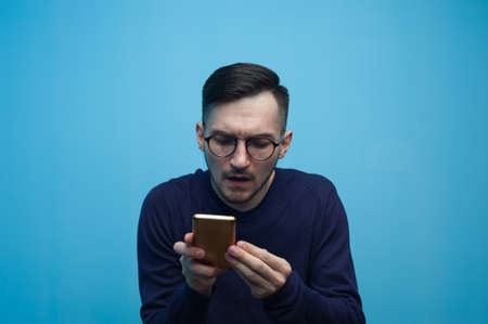 Studio portrait young disappointed man holding phone on a blue background with copy space. People, emotions.