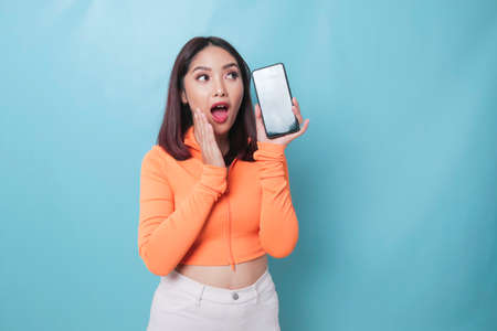 A surprised young woman pointing at copy space on her smartphone in her hand, isolated on blue background
