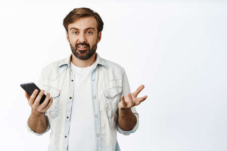 Confused bearded man shrugging while holding mobile phone, cant understand smth on smartphone app, looking puzzled at camera, white background