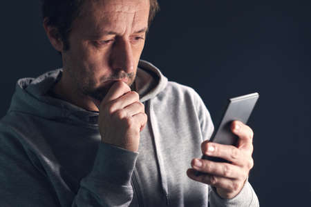 Serious thoughtful mid-adult male looking at mobile smart phone screen with finger on lips and reading text message, close up with selective focus