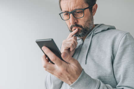 Worried casual mid-adult man looking at the screen of his smartphone with one hand on the chin