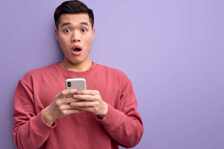 Shocked and surprised asian man looking smartphone. Amazed young guy reads a message on the phone.