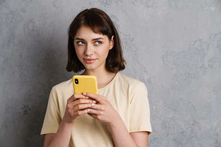 Portrait of a beautiful smiling young girl in casual clothes standing isolated over gray background, using mobile phone