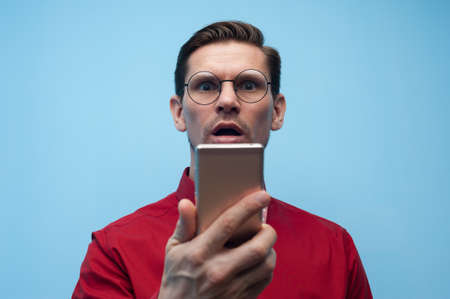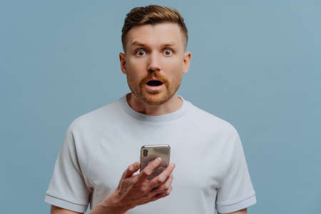 Surprised young unshaven man in white shirt having shocked facial expression while holding smartphone and looking at camera, standing against blue studio background. Human emotions concept