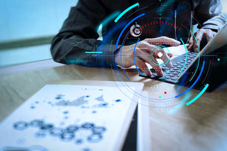 Health care and medical services with circular AR diagram record.Medical technology concept. Doctor hand working with modern digital tablet dock screen computer with medical chart interface.