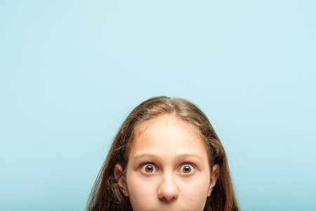 startled surprised shocked girl peeking out from the bottom of blue background. emotion and facial expression concept.