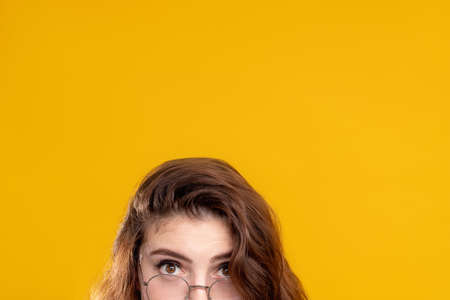 Special offer. Commercial background. Shocked woman eyes in glasses looking at camera isolated on orange copy space. Sale discount. Opportunity chance. Unexpected surprise.