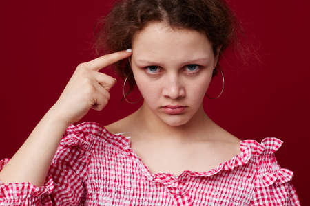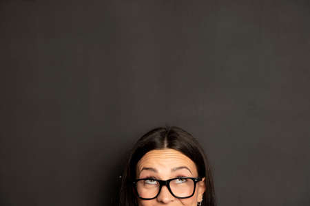 Closeup dissatisfied female model thinking on grey background. Portrait displeased woman looking camera. Serious lady posing indoors. Pensive unhappy girl standing in studio. Thoughtful girl face