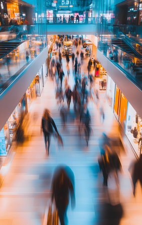 A dynamic view of busy shoppers in a modern shopping mall, showcasing the vibrant energy and movement of consumer culture.