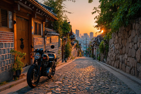 Motorcycle rests on cobblestone street at sunset, framed by traditional buildings and lush greenery, illustrating the blend of urban and natural elements
