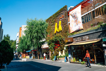 Seoul, South Korea - March 2, 2018 : Local shops - lined at Hongdae (Hongik University) shopping street. Hongdae is a shopping cultural street for young people in Seoul.