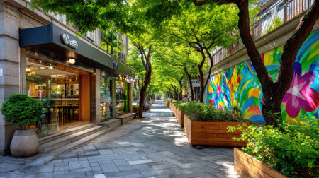 A picturesque urban street scene featuring a tree-lined pathway, vibrant mural, and inviting cafe that creates a welcoming atmosphere for relaxation and exploration.