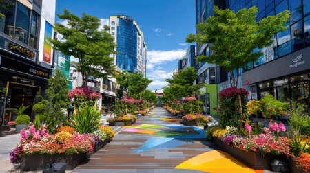 A stunning urban scene featuring a vibrant street adorned with colorful flowers and lush trees, complemented by modern architecture under a clear blue sky.