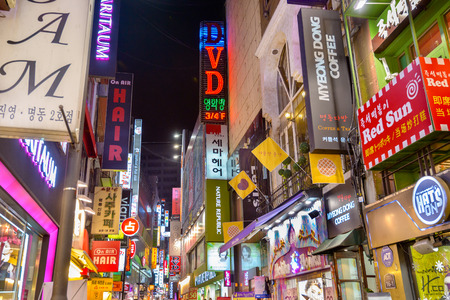 SEOUL - NOVEMBER 5: Myeong-Dong Neon Lights November 5, 2013 in Seoul, South Korea. The location is the premiere district for shopping in the city.