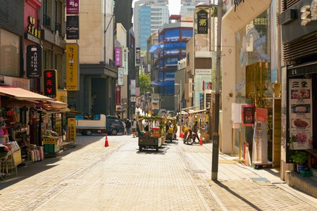 Busan, South Korea, September 14, 2019: view of shopping street Gwangbok-ro crowded with people on sunny day