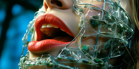 a woman with long hair, styled in organic biomorphism, is captured in this photo. her hair sticks out by her mouth, creating a unique visual effect. the image, taken with a macro lens, showcases dark orange tones and precise hyperrealism. the plastic-like texture adds an interesting element to the composition. this photo exudes a bombacore aesthetic, with a touch of dark comedy. ai generated