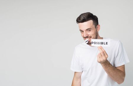 Young man isolated over background. Posing alone on camera with possible work in hand. Hold another piece of paper between lips. Self-confident handsome guy posing.