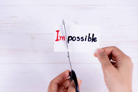 Businessman taking away letters IM from the word impossible changing it into possible spelled on individual white cards lying on cracked old wooden desk. Conceptual of positive attitude.