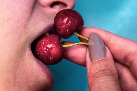 Shown with detailed and realistic lips in front of the camera. A medical theme is included in the image. Possibly related to cranberries. The illusionist loves attention to detail in a photograph.