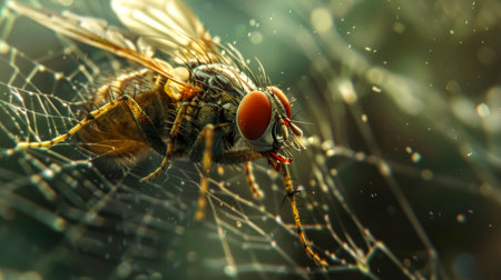 House fly trapped in spider web struggling to break free