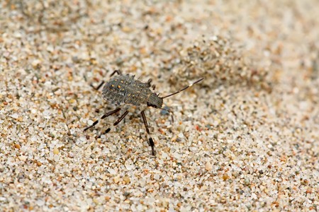 Black beetle Tenebrionidae Adesmia in the desert over sand background