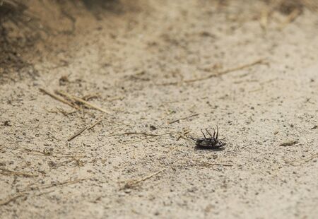 big and dead beetle on the ground. The beetle lies with folded paws on its back. ... beetle in hibernation. insects after chemicals