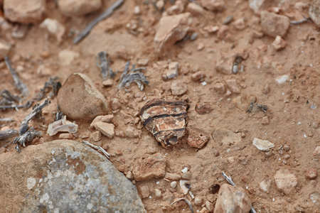 Cricket on a rocky soil ground at Sabino Canyon State Park in Tucson, Arizona. Selective focus of a cricket camouflage in between the rocks.