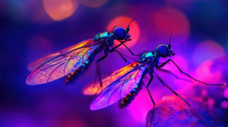 This striking macro image captures two vibrant insects in stunning detail, showcasing their intricate wings and striking colors against a dreamy backdrop.