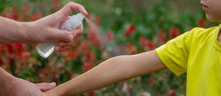 Father insect applying repellent spray to child's hand outdoors. Selective focus.