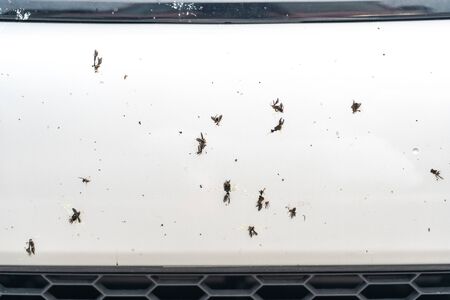 Insects on the background of river. Mosquitoes near the river in Latvia. Abstract background of insects and river; Insects in spring, Latvia. Flying insects on dark river background.