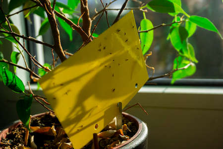 Trapped fungus gnats on sticky yellow trap paper. Close up, green potted plant in the background, no people