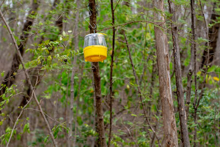 Side bottom view of a yellow pheromone fly trap hanging from a tree.