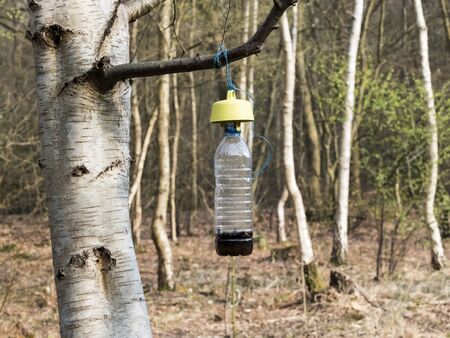 Ecological olive fly trap, plastic bottle with bait for insects hanging on tree branch, to protect bees hive life.