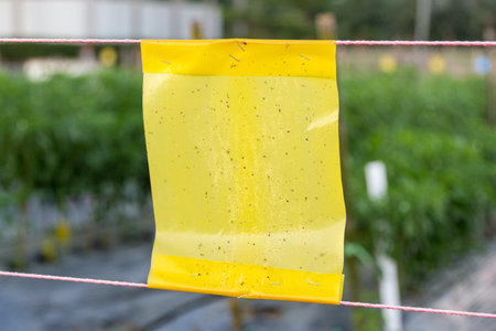 Yellow sticky trap with bugs and vermin in a greenhouse