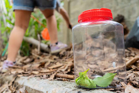 Asian girl, she is having adventures in the world. Standing on a log while catching bugs, plastic insect box