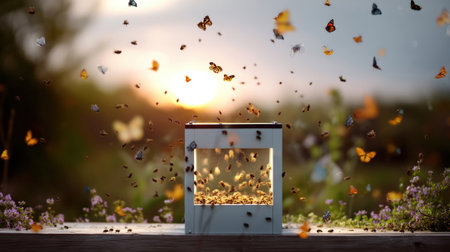 A clear sunset backdrop featuring a solarpowered pollen sensor its display panel glowing with bees and butterflies hovering nearby