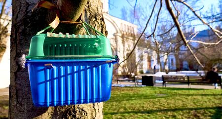 a trap for Bactrocera oleae flies, whose larvae feed on the fruit of olive trees, hangs from the branches of an olive tree, in a panoramic format to use as web banner