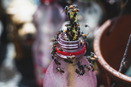 Wasp Trap. A wasp trap with lots of dead wasps floating in liquid.