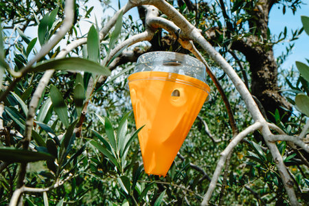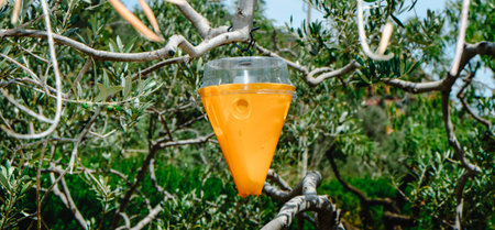 closeup of a trap for Bactrocera oleae flies, whose larvae feed on the fruit of olive trees, hanging from the branches of an olive tree, in a grove in Catalonia, Spain
