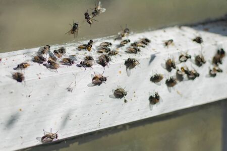 A sticky fly paper trap is covered with many dead flies and a few live ones, showcasing pest control measures in a close up shot.