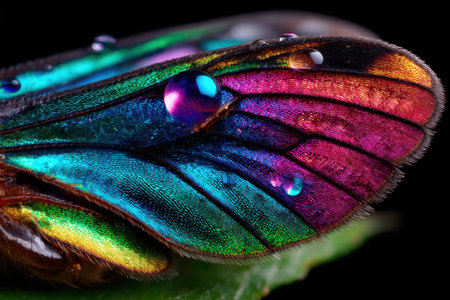 Close-up view of a butterfly wing displaying vibrant colors and intricate patterns with water droplets.