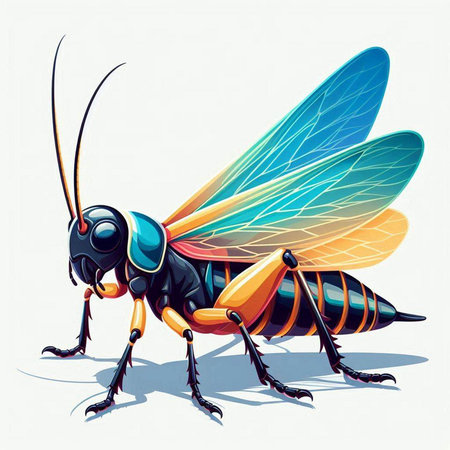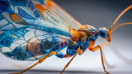 A vivid close-up reveals a delicate, jewel-like creature with shimmering hues, highlighting its translucent wings and complex body architecture in stunning detail.
