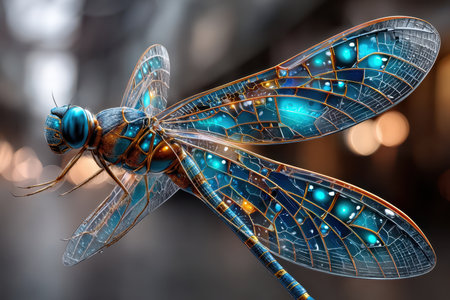 A dragonfly with vibrant, luminous wings hovers gracefully in a softly lit urban setting at dusk.