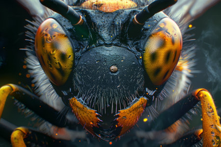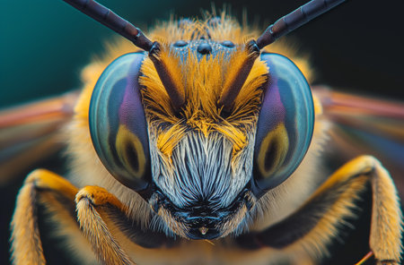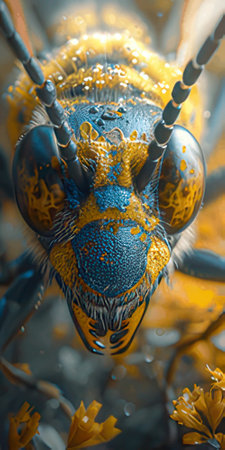 A stunning macro shot capturing the intricate details of a yellow and black insects face showcasing its large eyes and textured surface.