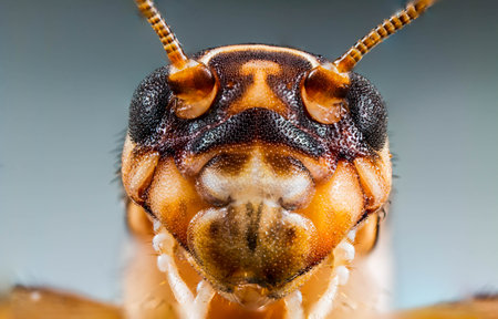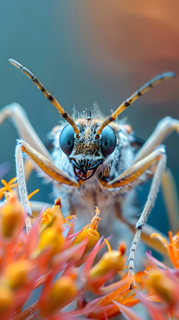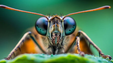 Close up of a vibrant insect with striking features, showcasing detailed antennae and eyes, against a soft teal background, perfect for nature and biology themes