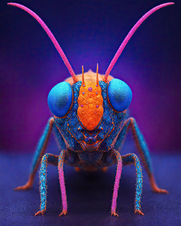 an insect with bright brown eyes and yellow eyes is depicted in this photo. the image showcases a vibrant combination of dark sky-blue and magenta colors, reminiscent of pop culture imagery. the photograph is created using focus stacking technique, resulting in a playfully intricate composition. the subject matter is inspired by aurorapunk and features explosive wildlife. ai generated