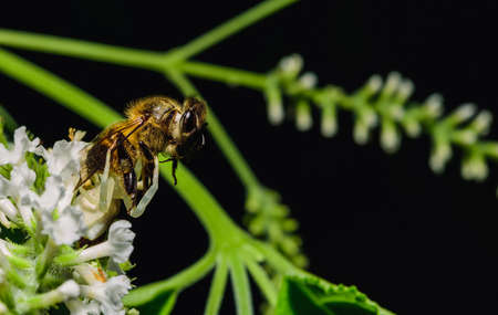 The little hairy wasp on a flower collecting nectar on a sunny summer day
