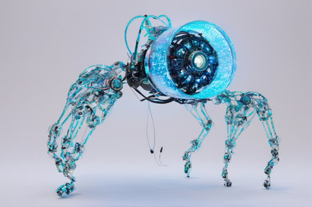 A detailed robotic creature features sleek lines and intricate mechanical components, suggesting motion and innovation.