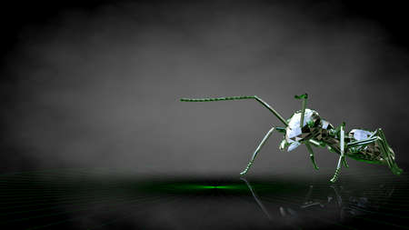 Mechanical cockroach with dark blue by a body and steel feet on a mirror white surface