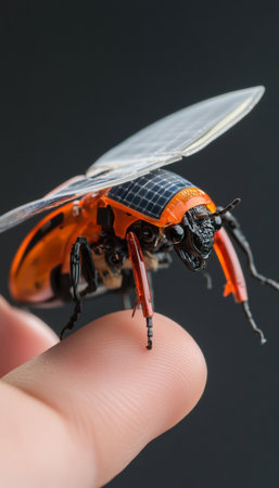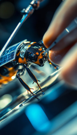 Intricate assembly a robotic hand attaches a mini solar panel to a robotic beetle s back